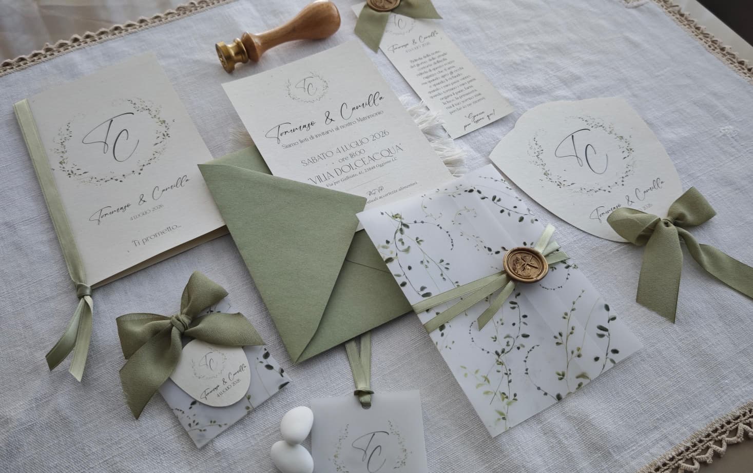 Perfetto per nozze dallo stile classico, romantico o shabby chic, questo invito trasmette un’eleganza sobria e senza tempo. Ogni dettaglio, dal sigillo in ceralacca ai nastri in tessuto pregiato, è curato con attenzione per rendere unico il vostro annuncio d’amore.