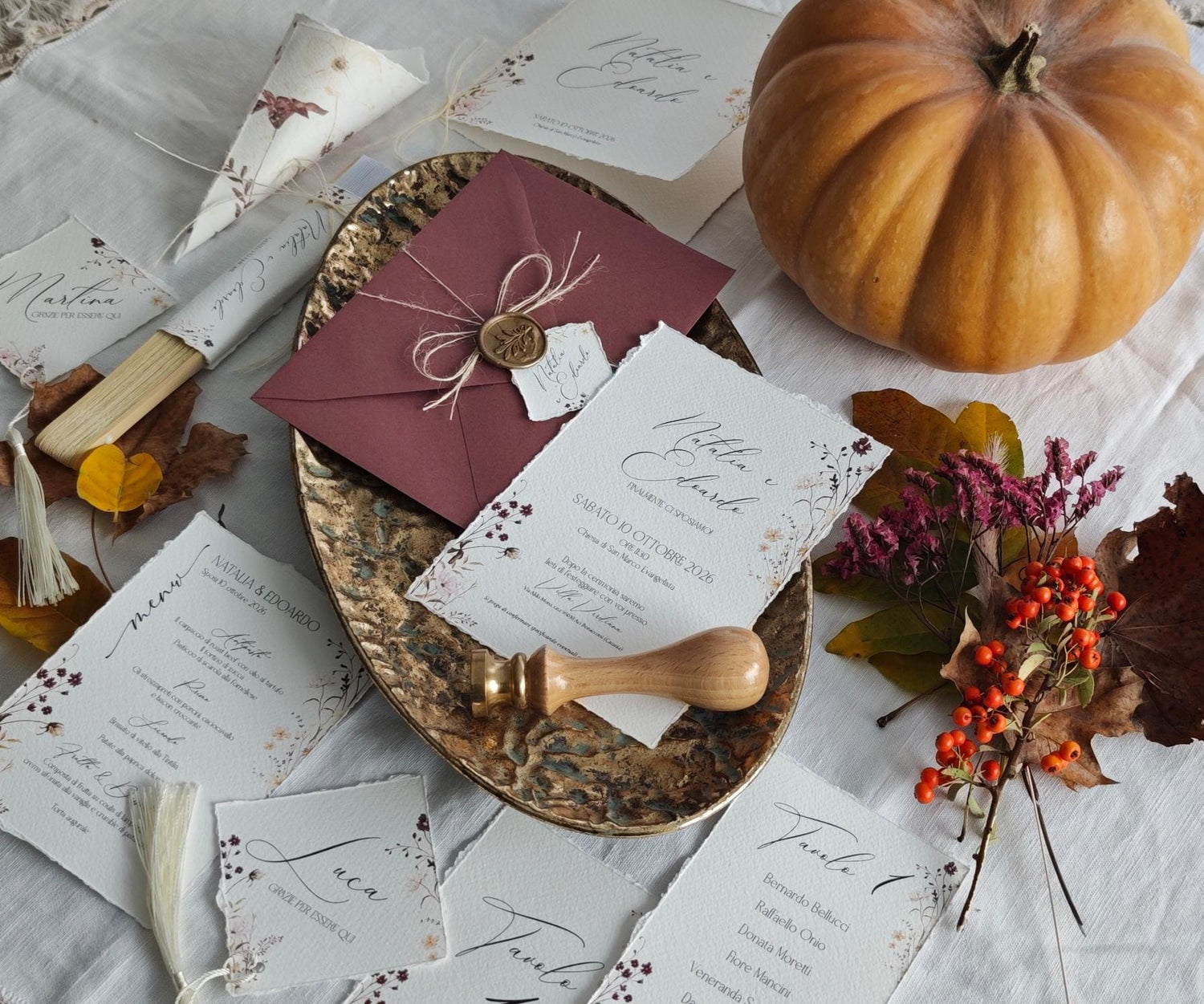 Questo invito di nozze è ispirato ai colori caldi e naturali dell’autunno: tonalità avvolgenti di bordeaux, oro e avorio si fondono in un design elegante e romantico.