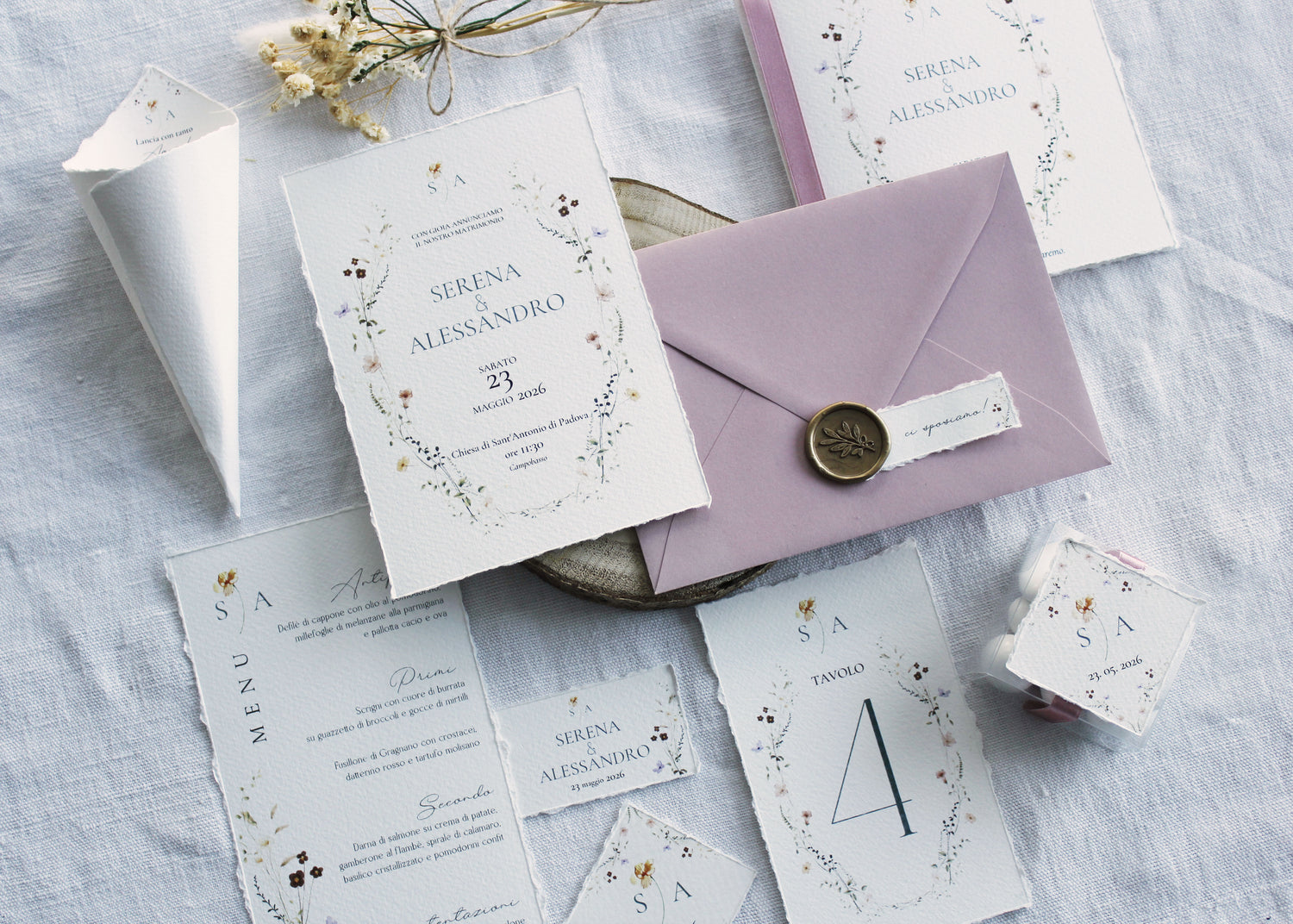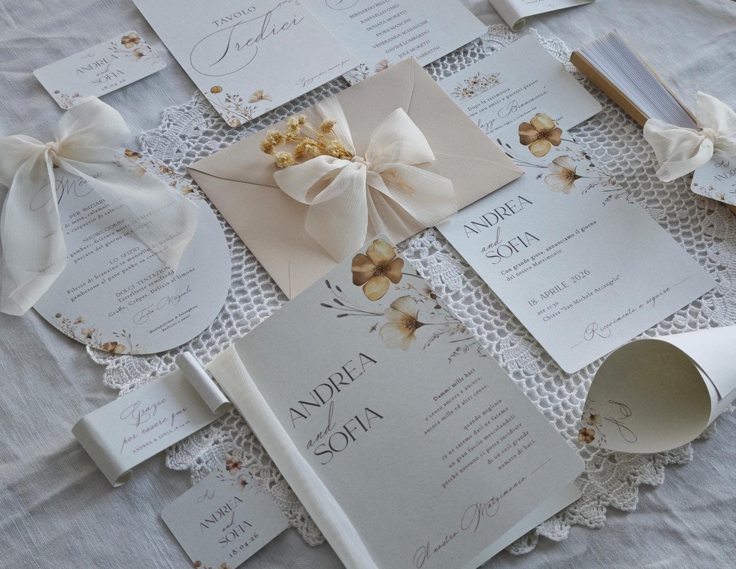 Stampato su carta artigianale con bordi irregolari, ogni dettaglio – dai delicati motivi floreali ai caratteri calligrafici – è pensato per trasmettere calore, autenticità e stile.