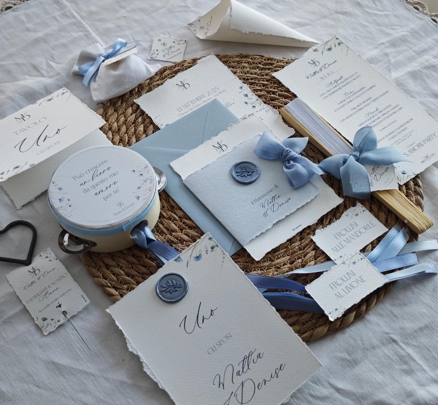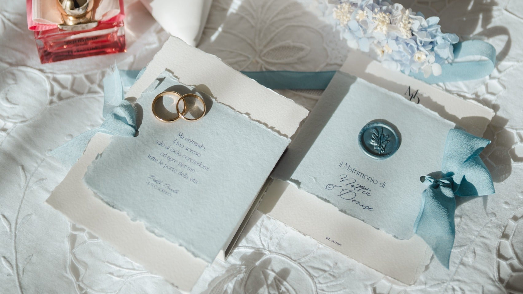 Un invito che racchiude tutta la delicatezza e il romanticismo del grande giorno. Realizzato su carta artigianale con bordi irregolari e texture naturale, si distingue per le sue tonalità azzurro polvere e avorio, impreziosite da un raffinato sigillo in ceralacca e da un nastro di seta in coordinato.