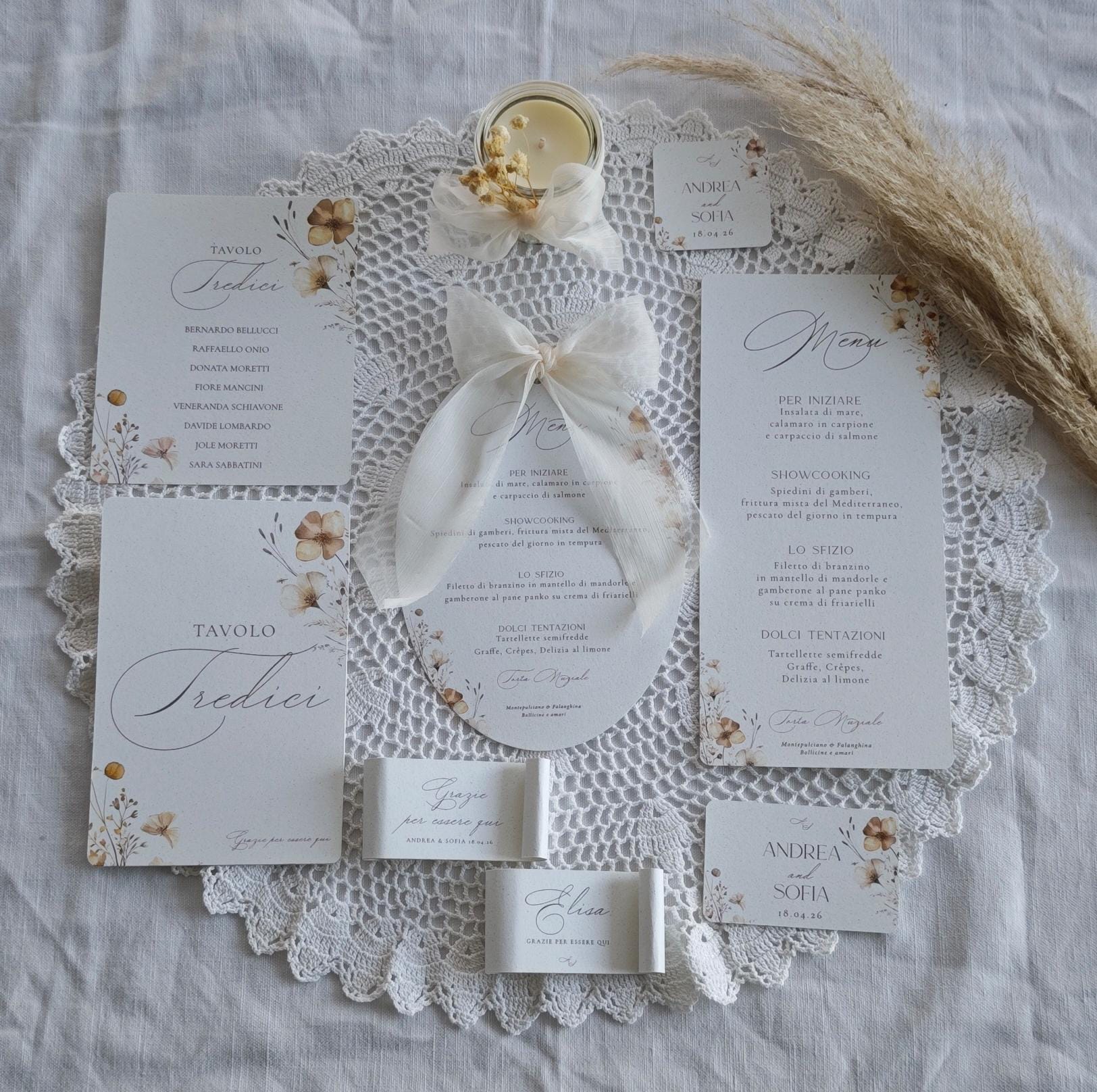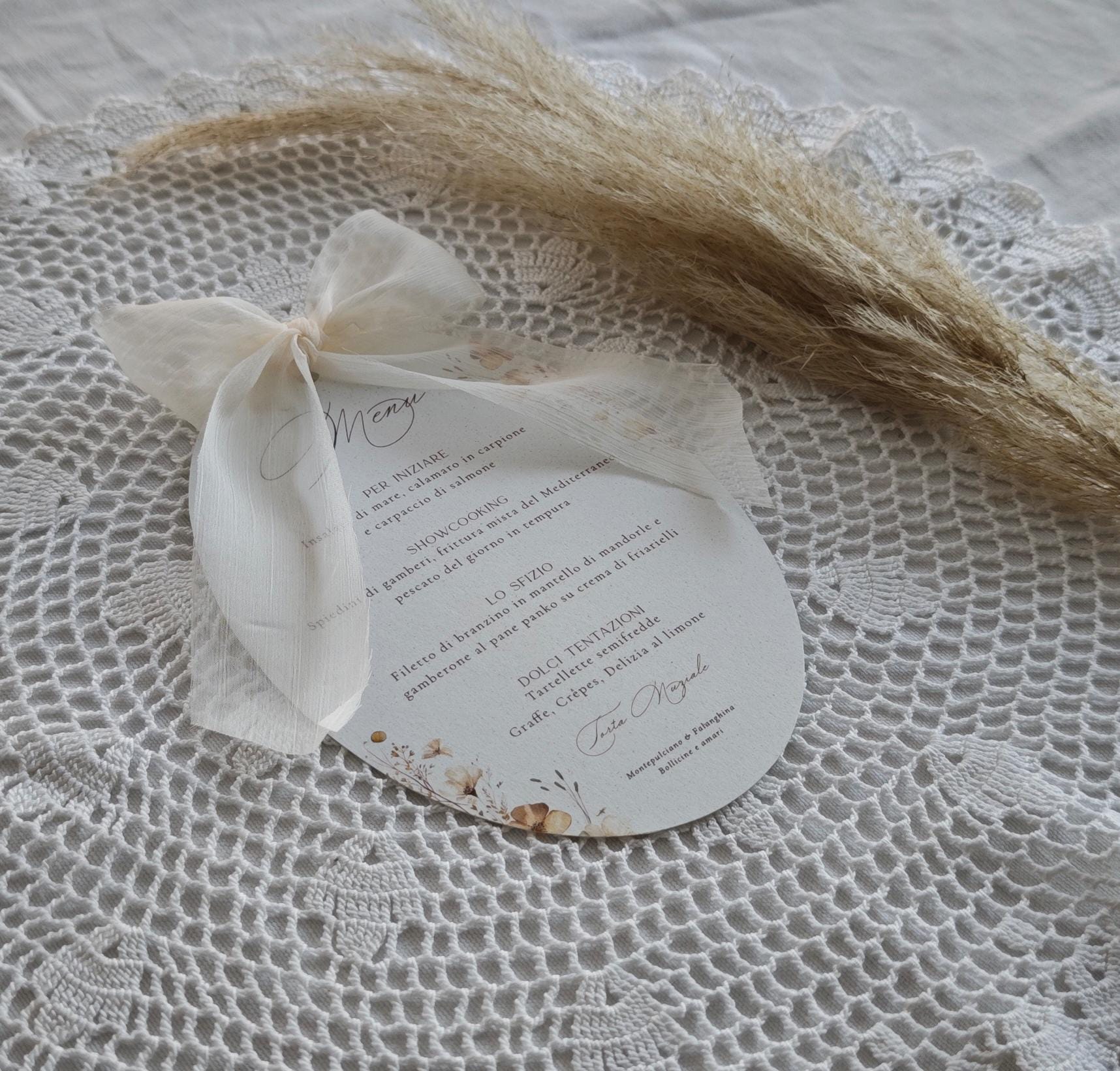 Kit coordinato per ristorante composto da menù a piatto, tag per tableau, segnatavolo e tag vari.