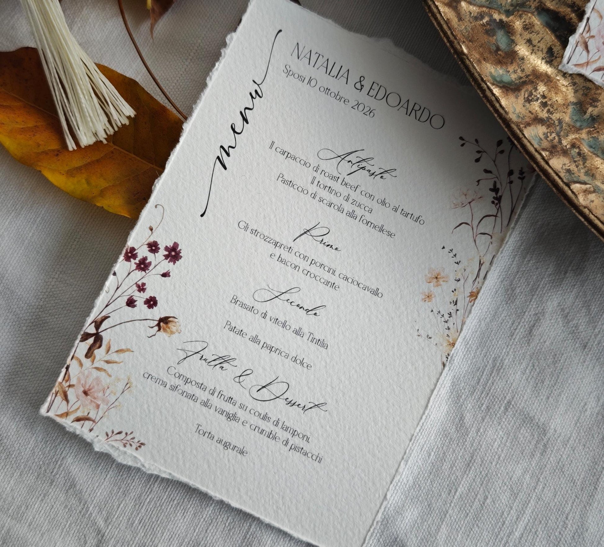 Kit coordinato per ristorante composto da menù a piatto, tag per tableau, segnatavolo e tag vari.