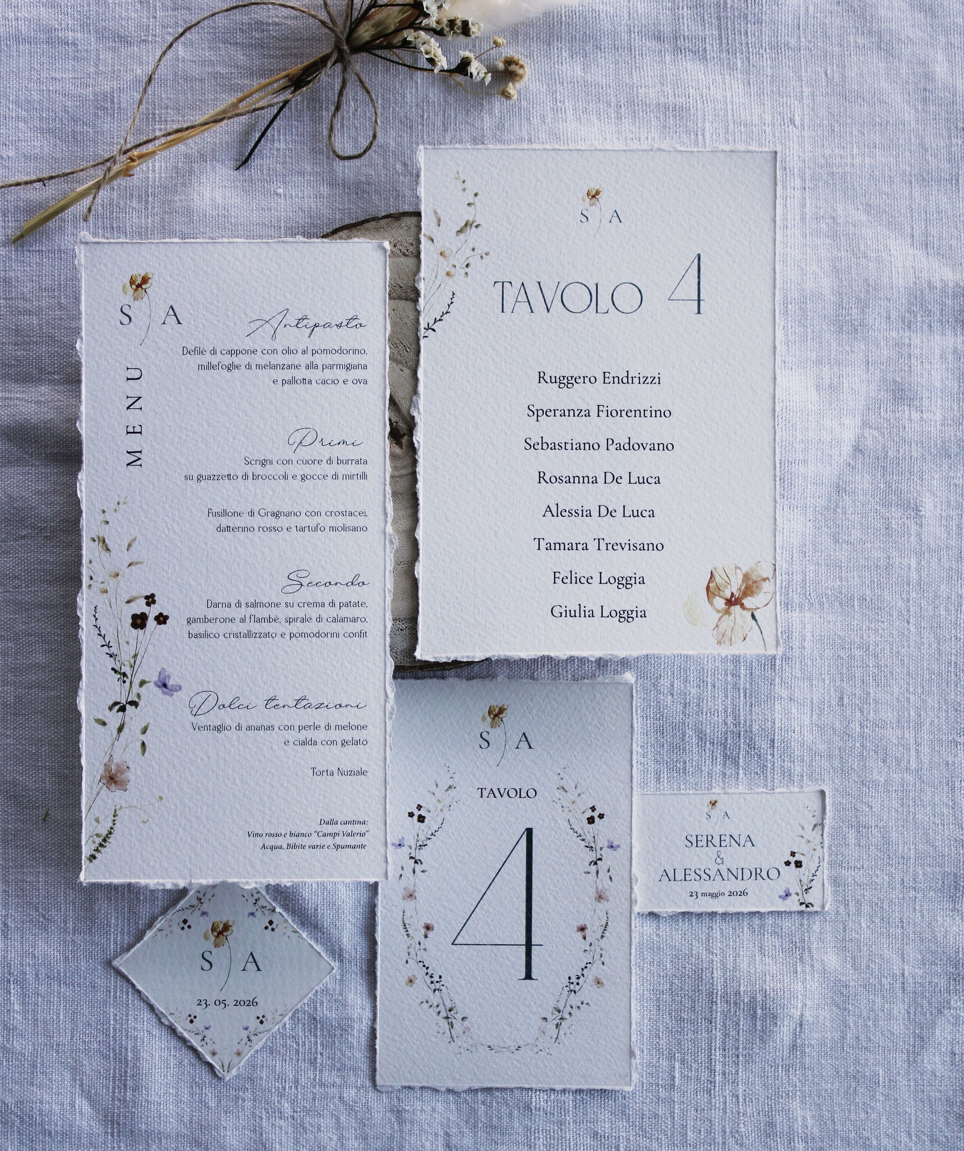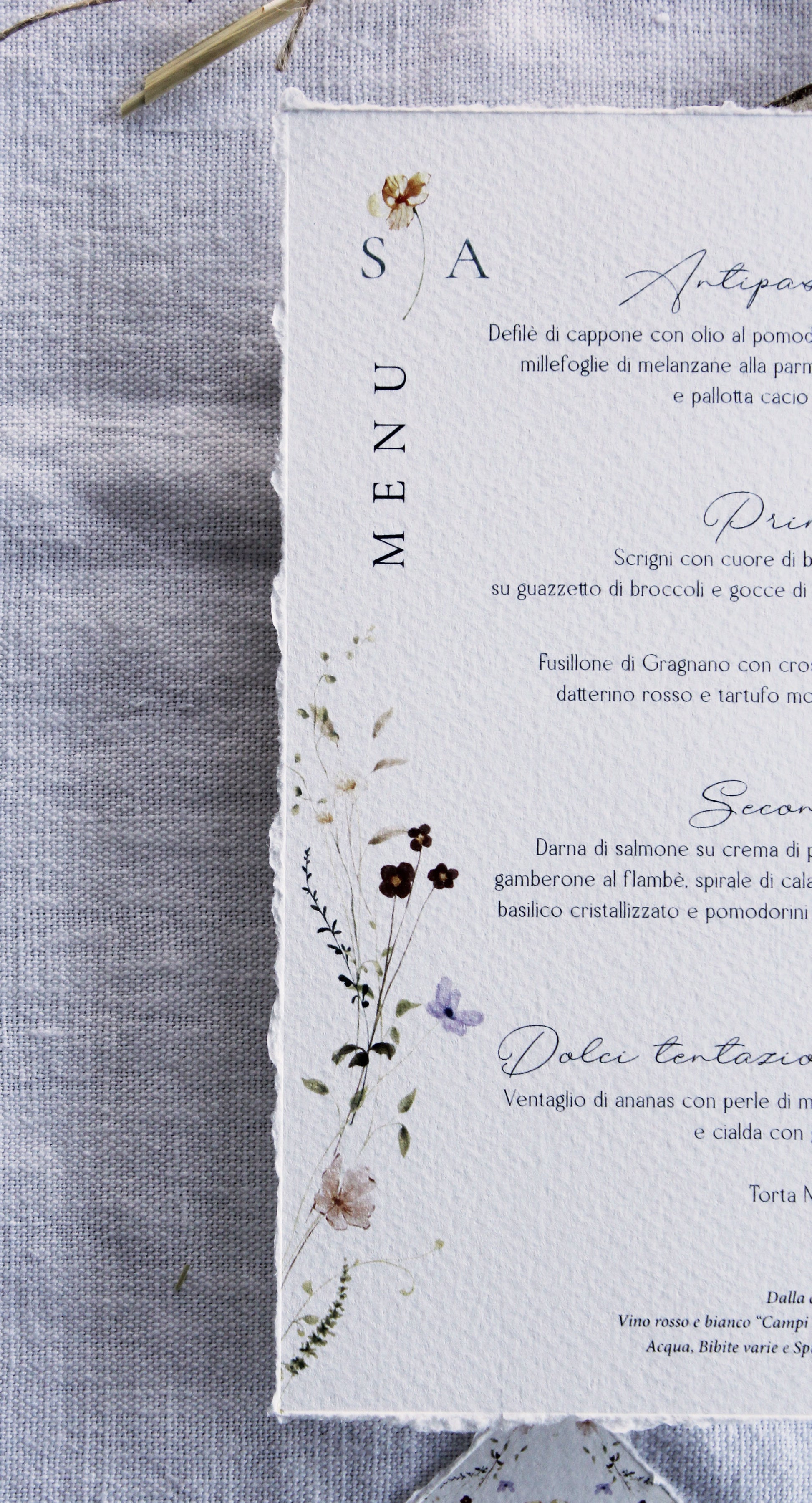 Kit coordinato per ristorante composto da menù a piatto, tag per tableau, segnatavolo e tag vari.